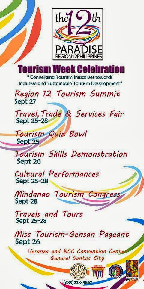 Other activities for the Tourism Week are the tourism quiz bowl, Cultural Performances, Travel and Tours, Miss Tourism -Gensan Pageant and the Mindanao Tourism Congress.